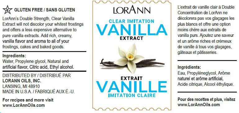 LorAnn’s Double Strength (2-fold) Clear Imitation Vanilla Extract will not discolor your whitest frostings and offers a less expensive alternative to pure vanilla extracts. Add rich, creamy, vanilla flavor and aroma to all of your frostings, cakes and baked goods. Contains no sugar or corn syrup.